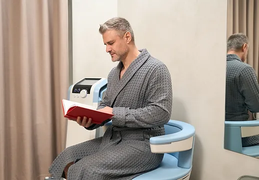 No. You remain fully clothed during the treatment and can return to your normal routine immediately after. It’s quick, discreet, and perfect for busy lifestyles.